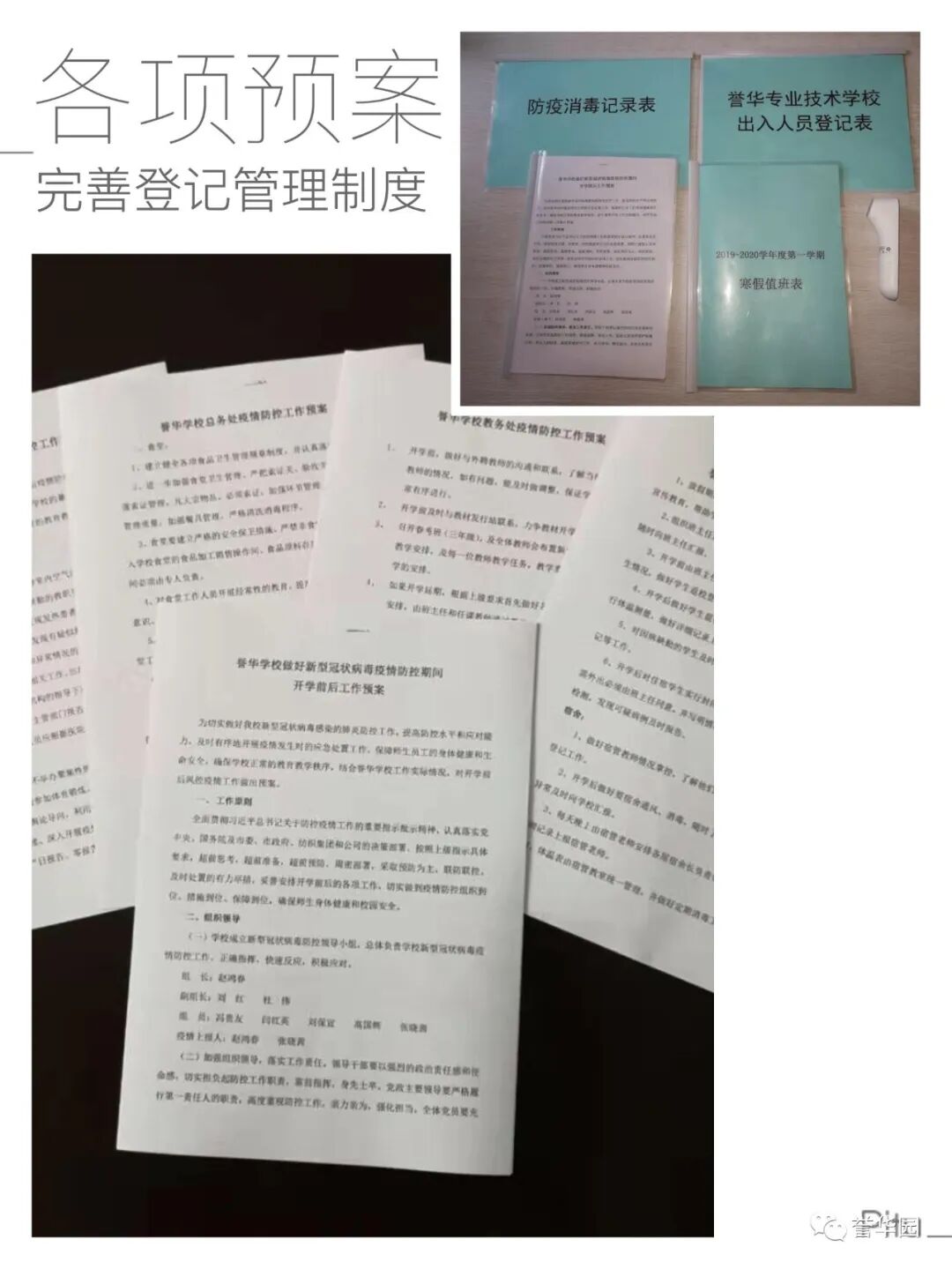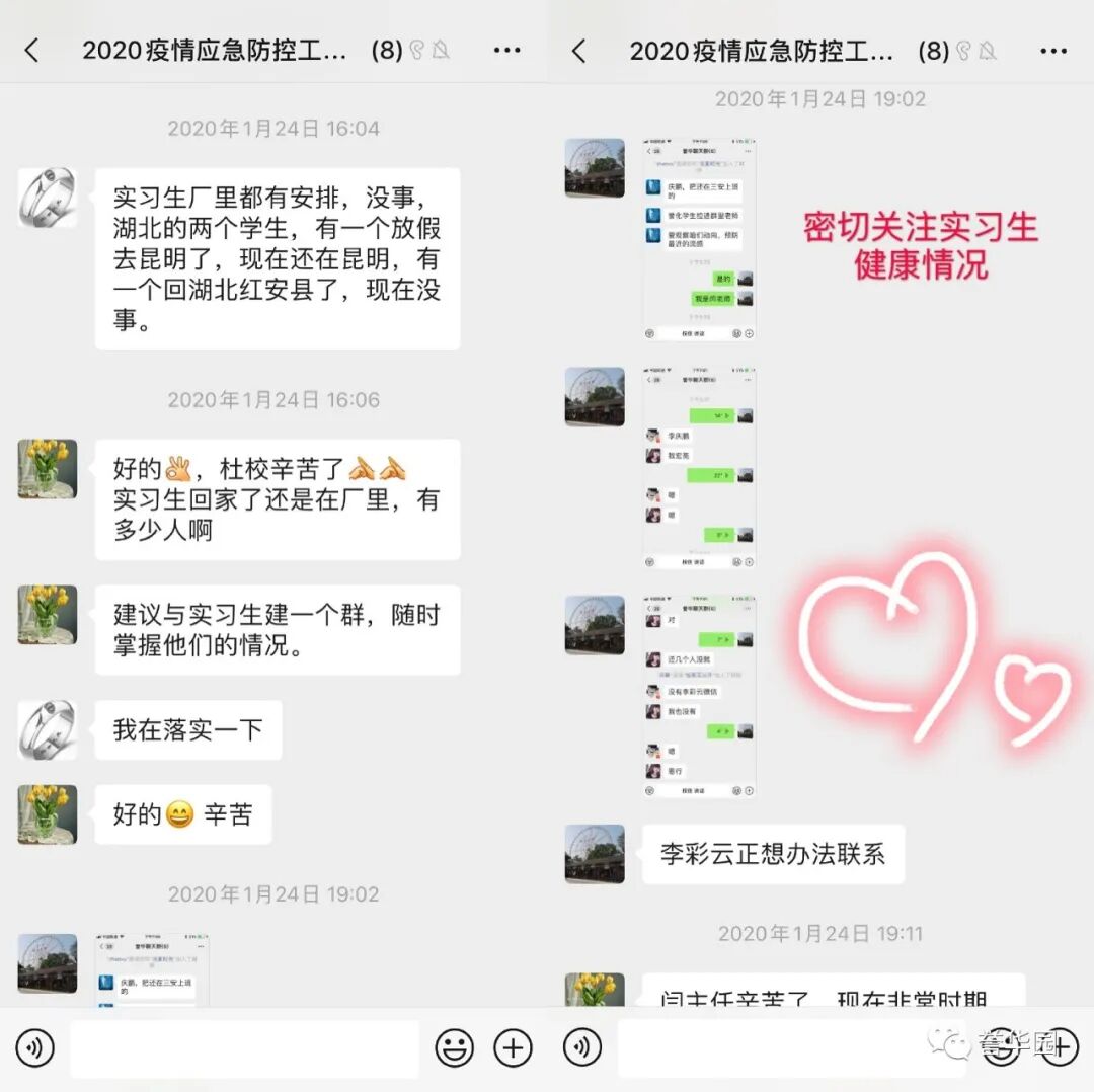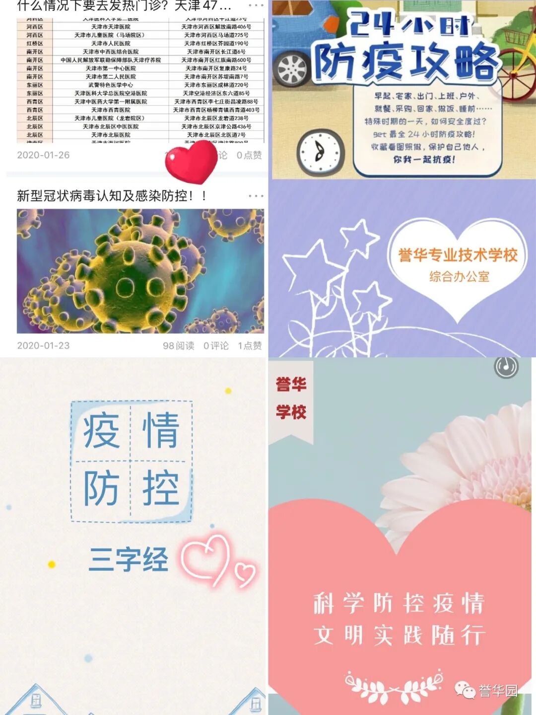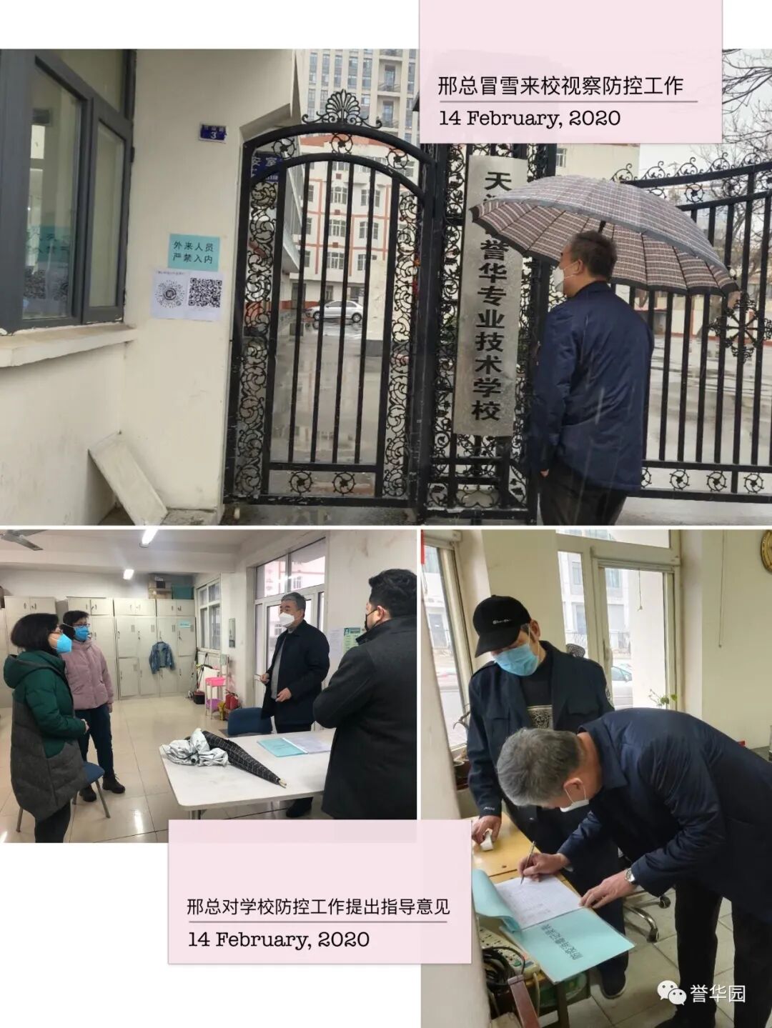 抗“疫”进行时 誉华专业技术学校 科学防控疫情 文明实践随行 新型冠状病毒感染的肺炎疫情发生以来,誉华专业技术学校认真落实上级文件精神,以高度负责的态度,以疫情为令迅速行动,全员联动有效防控,确保师生生命安全和身体健康,扎实开展新型冠状病毒感染的肺炎疫情防控工作。 领导班子迅速响应 制定完善应急预案 疫情发生后,学校领导班子高度重视,第一时间成立以赵鸿春校长为组长的学校疫情防控领导小组,分别与1月23日、1月28日、2月7日、2月14日四次领导班子疫情防控专题工作会议,制定了《防治新型冠状病毒感染的肺炎应急预案》,各部门制定了具体实施方案。同时,根据上级最新要求,尽早研究制定《誉华学校做好新型冠状病毒疫情防控期间开学前后工作预案》。 学校领导干部坚守岗位,24小时在岗带班,靠前指挥,靠前服务全体师生。校党支部向全体党员发出倡议,全校党员教师积极发挥先锋模范作用,带头落实防控措施,带头严守纪律,坚守岗位,尽职尽责。在校领导的积极应对、科学部署下,学校各项防疫工作开展扎实、有序。 2月14日飞天纺饰针棉公司党委书记、董事长邢建平同志冒雪亲临学校对疫情防控工作检查指导,对学校下一步工作做出重要指示和部署。 2月12日、2月24日党委副书记肖健同志两次抽查学校疫情防控具体工作落实情况,并送来防控物资,给我们进一步做好防控工作巨大鼓舞。 2月25日人社局职业技能建设处吴立国处长和马晨同志莅临我校检查指导疫情防控工作,全面了解学校情况,帮助学校解决困难,并提出要求,要把疫情防控作为当前的头等大事抓紧抓细抓实,确保师生生命健康安全。 宣传形式多样化 尽显对师生关怀 疫情发生以来,学校先后通过微信公众号、誉华园工作群、班级群、QQ群、校园橱窗等途径,及时向师生宣传中央决策部署、疫情防控知识、学校防控安排,做到人人知晓。并以给学生和家长的一封信、防控疫情知识等形式加以宣传,倡导家长帮助积极学习防控知识、督促学生加强体育锻炼,增强体质,教育学生做好个人防护工作,勤洗手,不到人流密集场所去,提高学生的健康意识和自我保护能力。 深入了解师生情况 精准摸排不遗漏 为了实时掌握全校师生的春节活动情况及健康状态,学校以班级为单位,从2月1日起实行人员动态“日报告”和“零报告”,并及时上报主管部门。确保人员信息排查报送及时准确,无漏报、虚报、迟报情况发生。 我校共有720名学生,教职员工29人,学生涉及本市、郊县和外省市。全体班主任每天及时、耐心地在微信群里或通过电话询问学生及家长的健康情况进行摸排,进行细致入微的询问和心理疏导。政教处对各班上报的信息进行汇总并及时上报。 全体教职工主动如实报告所在位置和本人、家庭成员健康状况,确保全覆盖不漏一人,切实做到精准细致摸排,做好疫情监测。 积极做好物资保障 加强校园环境治理 学校总务处行动迅速,第一时间拟定了总务防疫方案;积极采购所需部分防疫物资;组织人员开展校园卫生清理不留死角,对校园进行全面消毒;加强校园防疫巡查,禁止校外人员入校,并对校内人员出入登记。 加强对实习生管理 确保学生身体健康 招生就业办公室加强与企业的密切联系,同时建立实习学生群,保证与学生随时沟通,及时了解和掌握学生在企业情况,掌握学生身体健康情况,加强健康和防疫宣传教育。 停课不停学 学习不延期 按照市劳动局“停课不停学 学习不延期”的统一要求,教务处积极做好推迟开学的各项安排,统一协调,根据各年级学生特点,制定了学生在家学习生活作息表,通过给学生及家长的一封信,与学生及家长建立联系,提出上课要求。建立班级微信群、QQ群,通过网络教学,线上授课,互动答疑,教学同步,学有所获。为保证教学质量,教务处管理人员进入到班级群,和学生一起听课,第一时间掌握学生的学习情况,及时听取反馈意见,真正做到停课不停学,取得较好的效果。 疫情阻挡了同学们外出的脚步,但阻挡不了他们的学习热情,在家长和老师的帮助下,每个同学都能按照科学的课程安排,有条不紊地学习。各级领导检查指导疫情防控工作