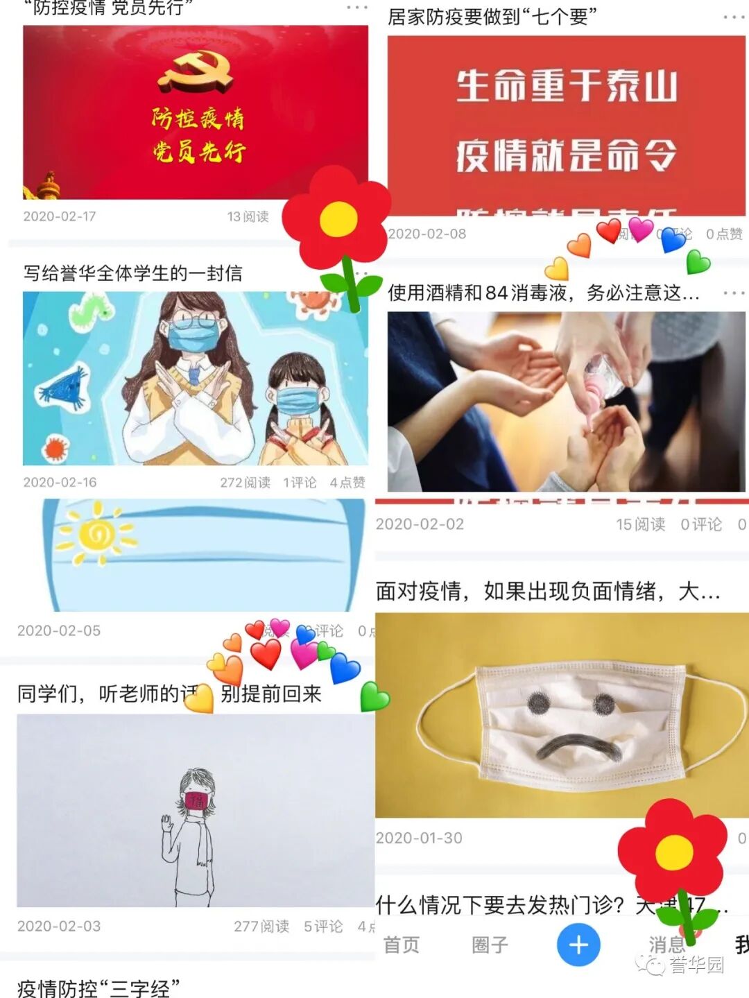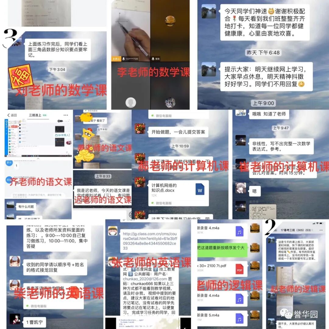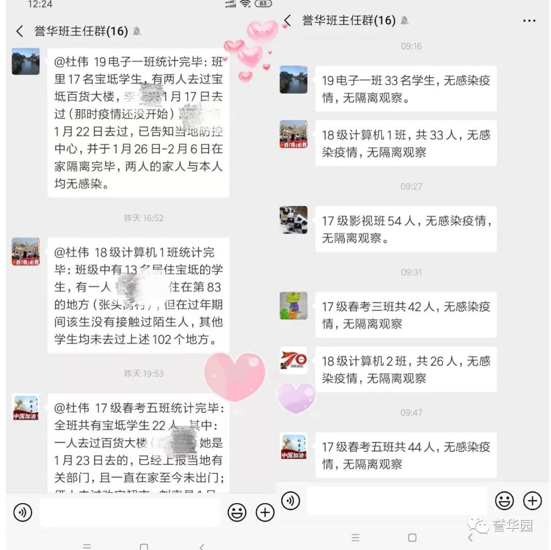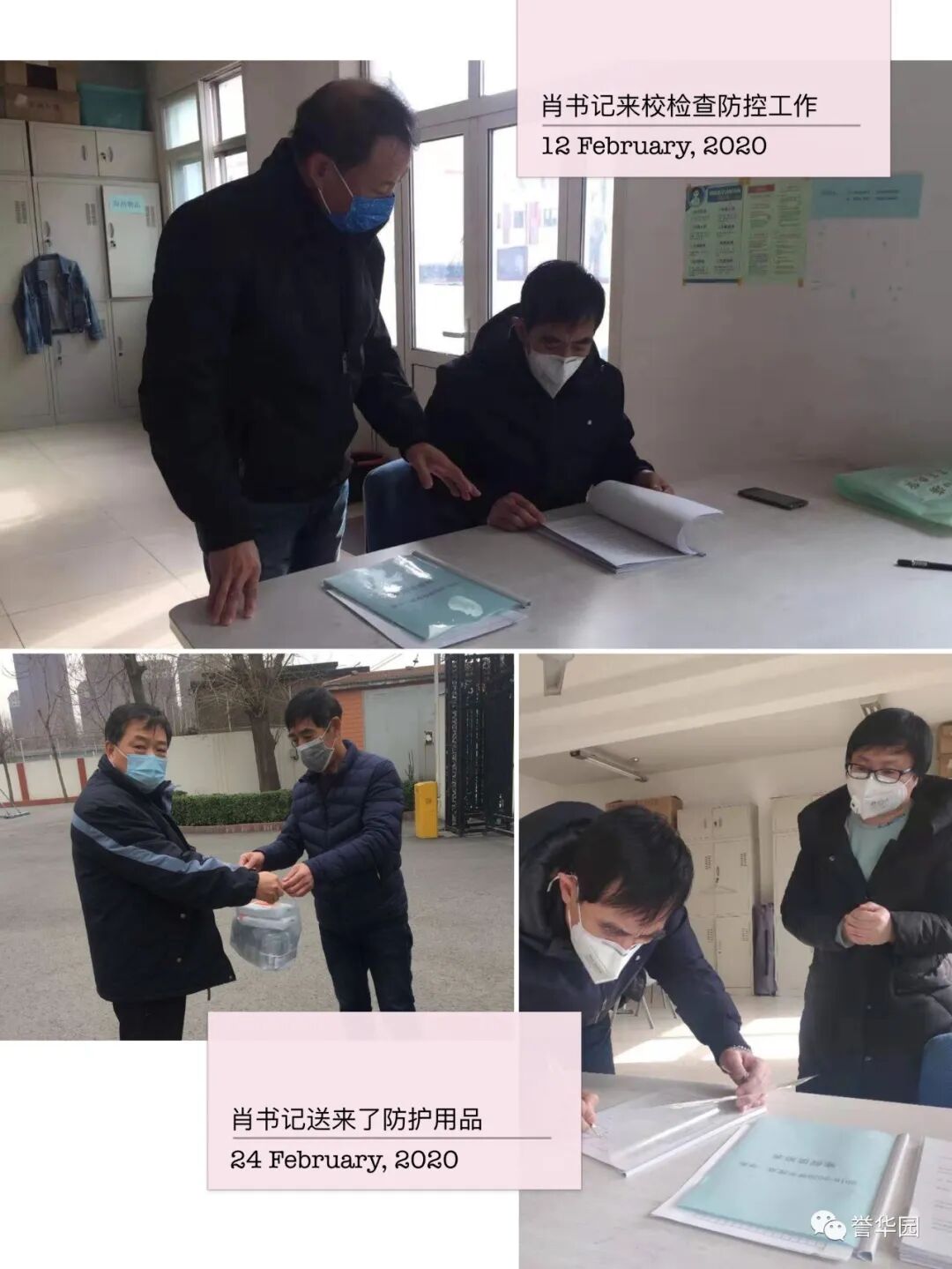 抗“疫”进行时 誉华专业技术学校 科学防控疫情 文明实践随行 新型冠状病毒感染的肺炎疫情发生以来,誉华专业技术学校认真落实上级文件精神,以高度负责的态度,以疫情为令迅速行动,全员联动有效防控,确保师生生命安全和身体健康,扎实开展新型冠状病毒感染的肺炎疫情防控工作。 领导班子迅速响应 制定完善应急预案 疫情发生后,学校领导班子高度重视,第一时间成立以赵鸿春校长为组长的学校疫情防控领导小组,分别与1月23日、1月28日、2月7日、2月14日四次领导班子疫情防控专题工作会议,制定了《防治新型冠状病毒感染的肺炎应急预案》,各部门制定了具体实施方案。同时,根据上级最新要求,尽早研究制定《誉华学校做好新型冠状病毒疫情防控期间开学前后工作预案》。 学校领导干部坚守岗位,24小时在岗带班,靠前指挥,靠前服务全体师生。校党支部向全体党员发出倡议,全校党员教师积极发挥先锋模范作用,带头落实防控措施,带头严守纪律,坚守岗位,尽职尽责。在校领导的积极应对、科学部署下,学校各项防疫工作开展扎实、有序。 2月14日飞天纺饰针棉公司党委书记、董事长邢建平同志冒雪亲临学校对疫情防控工作检查指导,对学校下一步工作做出重要指示和部署。 2月12日、2月24日党委副书记肖健同志两次抽查学校疫情防控具体工作落实情况,并送来防控物资,给我们进一步做好防控工作巨大鼓舞。 2月25日人社局职业技能建设处吴立国处长和马晨同志莅临我校检查指导疫情防控工作,全面了解学校情况,帮助学校解决困难,并提出要求,要把疫情防控作为当前的头等大事抓紧抓细抓实,确保师生生命健康安全。 宣传形式多样化 尽显对师生关怀 疫情发生以来,学校先后通过微信公众号、誉华园工作群、班级群、QQ群、校园橱窗等途径,及时向师生宣传中央决策部署、疫情防控知识、学校防控安排,做到人人知晓。并以给学生和家长的一封信、防控疫情知识等形式加以宣传,倡导家长帮助积极学习防控知识、督促学生加强体育锻炼,增强体质,教育学生做好个人防护工作,勤洗手,不到人流密集场所去,提高学生的健康意识和自我保护能力。 深入了解师生情况 精准摸排不遗漏 为了实时掌握全校师生的春节活动情况及健康状态,学校以班级为单位,从2月1日起实行人员动态“日报告”和“零报告”,并及时上报主管部门。确保人员信息排查报送及时准确,无漏报、虚报、迟报情况发生。 我校共有720名学生,教职员工29人,学生涉及本市、郊县和外省市。全体班主任每天及时、耐心地在微信群里或通过电话询问学生及家长的健康情况进行摸排,进行细致入微的询问和心理疏导。政教处对各班上报的信息进行汇总并及时上报。 全体教职工主动如实报告所在位置和本人、家庭成员健康状况,确保全覆盖不漏一人,切实做到精准细致摸排,做好疫情监测。 积极做好物资保障 加强校园环境治理 学校总务处行动迅速,第一时间拟定了总务防疫方案;积极采购所需部分防疫物资;组织人员开展校园卫生清理不留死角,对校园进行全面消毒;加强校园防疫巡查,禁止校外人员入校,并对校内人员出入登记。 加强对实习生管理 确保学生身体健康 招生就业办公室加强与企业的密切联系,同时建立实习学生群,保证与学生随时沟通,及时了解和掌握学生在企业情况,掌握学生身体健康情况,加强健康和防疫宣传教育。 停课不停学 学习不延期 按照市劳动局“停课不停学 学习不延期”的统一要求,教务处积极做好推迟开学的各项安排,统一协调,根据各年级学生特点,制定了学生在家学习生活作息表,通过给学生及家长的一封信,与学生及家长建立联系,提出上课要求。建立班级微信群、QQ群,通过网络教学,线上授课,互动答疑,教学同步,学有所获。为保证教学质量,教务处管理人员进入到班级群,和学生一起听课,第一时间掌握学生的学习情况,及时听取反馈意见,真正做到停课不停学,取得较好的效果。 疫情阻挡了同学们外出的脚步,但阻挡不了他们的学习热情,在家长和老师的帮助下,每个同学都能按照科学的课程安排,有条不紊地学习。各级领导检查指导疫情防控工作