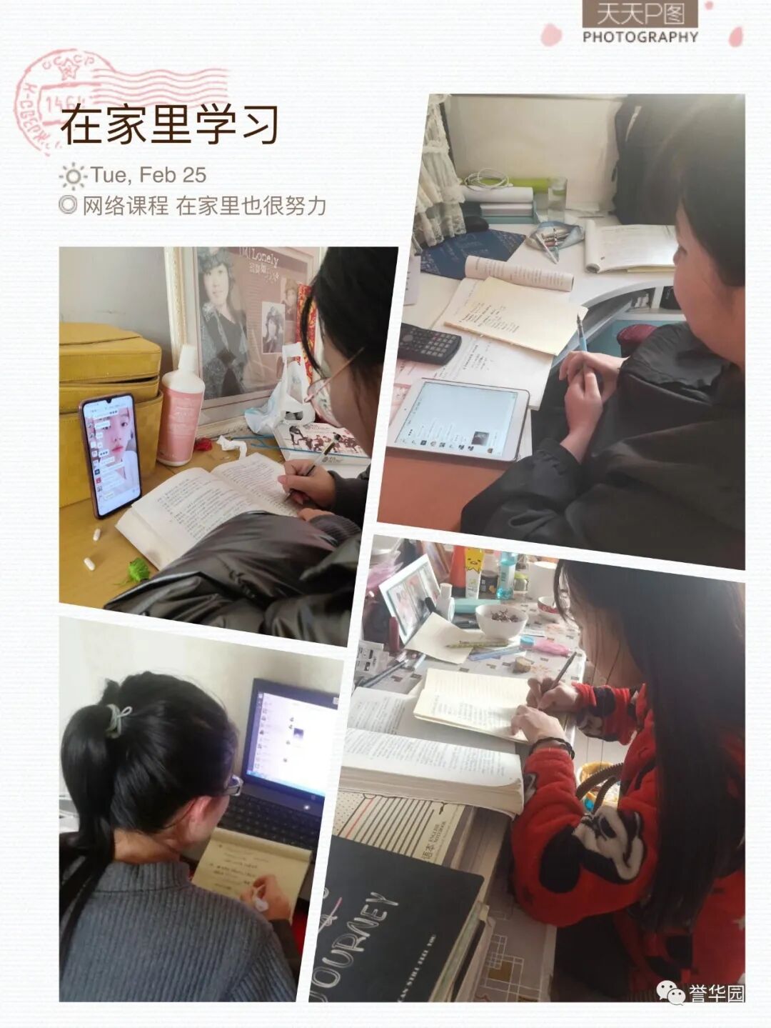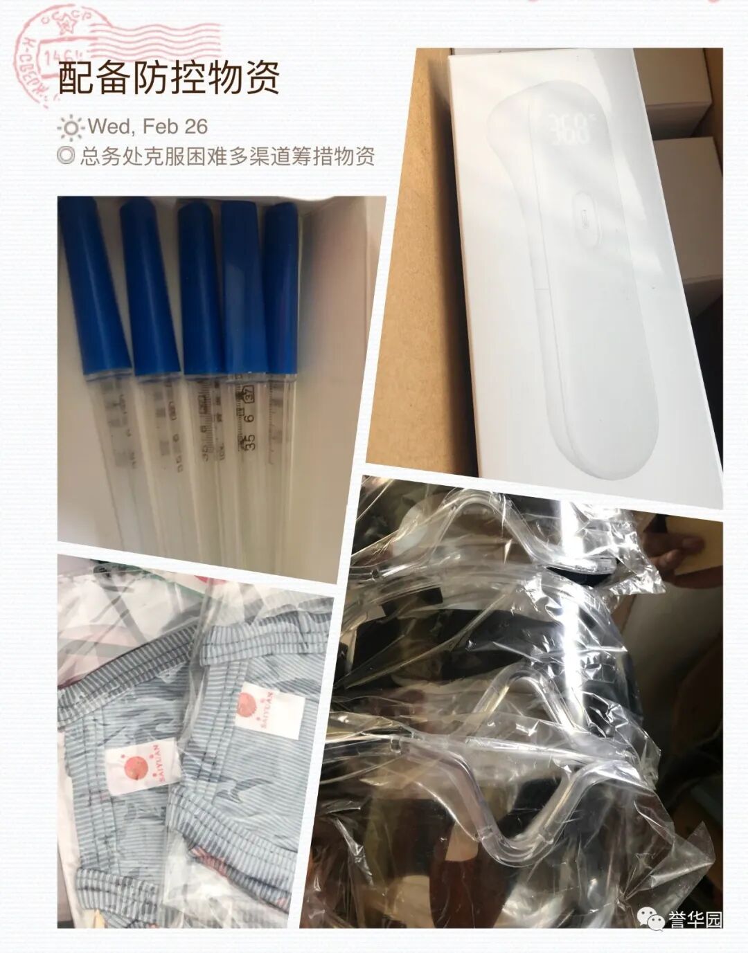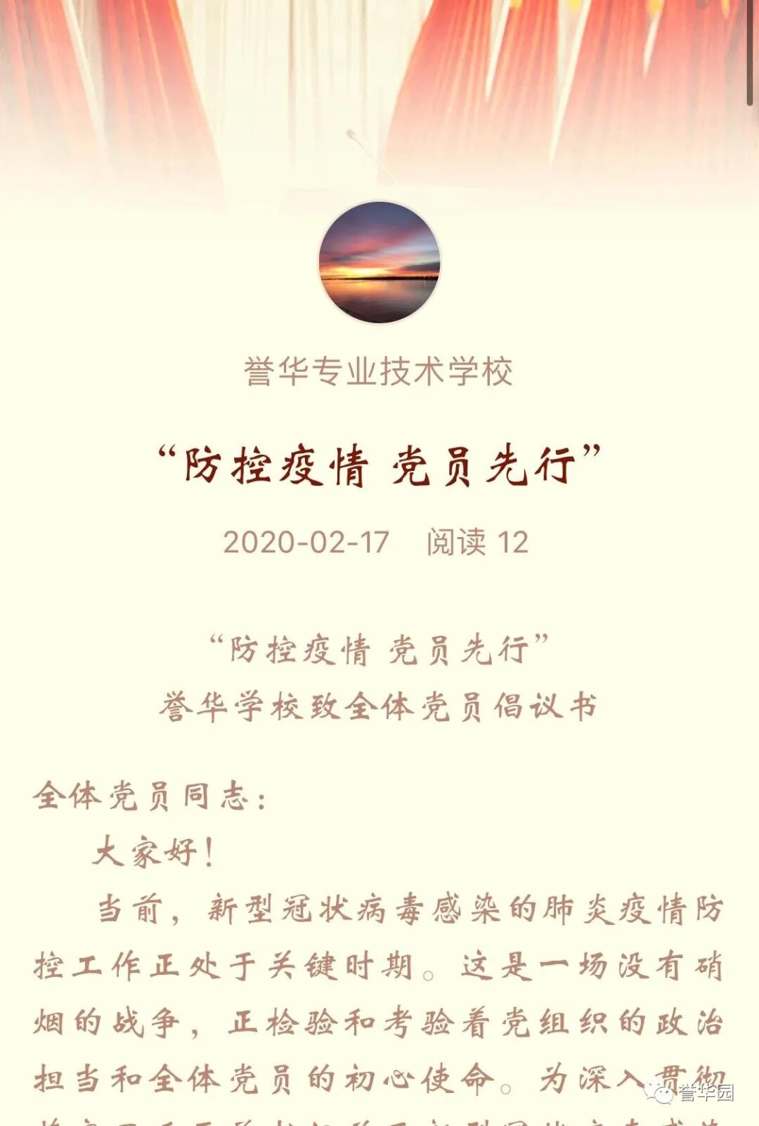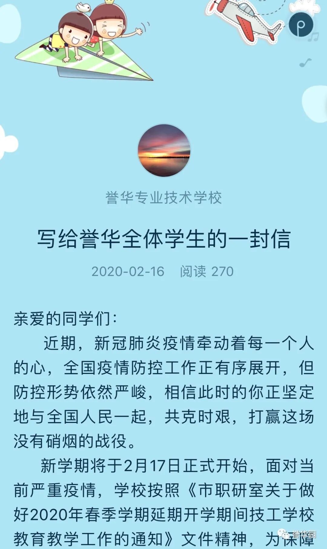 抗“疫”进行时 誉华专业技术学校 科学防控疫情 文明实践随行 新型冠状病毒感染的肺炎疫情发生以来,誉华专业技术学校认真落实上级文件精神,以高度负责的态度,以疫情为令迅速行动,全员联动有效防控,确保师生生命安全和身体健康,扎实开展新型冠状病毒感染的肺炎疫情防控工作。 领导班子迅速响应 制定完善应急预案 疫情发生后,学校领导班子高度重视,第一时间成立以赵鸿春校长为组长的学校疫情防控领导小组,分别与1月23日、1月28日、2月7日、2月14日四次领导班子疫情防控专题工作会议,制定了《防治新型冠状病毒感染的肺炎应急预案》,各部门制定了具体实施方案。同时,根据上级最新要求,尽早研究制定《誉华学校做好新型冠状病毒疫情防控期间开学前后工作预案》。 学校领导干部坚守岗位,24小时在岗带班,靠前指挥,靠前服务全体师生。校党支部向全体党员发出倡议,全校党员教师积极发挥先锋模范作用,带头落实防控措施,带头严守纪律,坚守岗位,尽职尽责。在校领导的积极应对、科学部署下,学校各项防疫工作开展扎实、有序。 2月14日飞天纺饰针棉公司党委书记、董事长邢建平同志冒雪亲临学校对疫情防控工作检查指导,对学校下一步工作做出重要指示和部署。 2月12日、2月24日党委副书记肖健同志两次抽查学校疫情防控具体工作落实情况,并送来防控物资,给我们进一步做好防控工作巨大鼓舞。 2月25日人社局职业技能建设处吴立国处长和马晨同志莅临我校检查指导疫情防控工作,全面了解学校情况,帮助学校解决困难,并提出要求,要把疫情防控作为当前的头等大事抓紧抓细抓实,确保师生生命健康安全。 宣传形式多样化 尽显对师生关怀 疫情发生以来,学校先后通过微信公众号、誉华园工作群、班级群、QQ群、校园橱窗等途径,及时向师生宣传中央决策部署、疫情防控知识、学校防控安排,做到人人知晓。并以给学生和家长的一封信、防控疫情知识等形式加以宣传,倡导家长帮助积极学习防控知识、督促学生加强体育锻炼,增强体质,教育学生做好个人防护工作,勤洗手,不到人流密集场所去,提高学生的健康意识和自我保护能力。 深入了解师生情况 精准摸排不遗漏 为了实时掌握全校师生的春节活动情况及健康状态,学校以班级为单位,从2月1日起实行人员动态“日报告”和“零报告”,并及时上报主管部门。确保人员信息排查报送及时准确,无漏报、虚报、迟报情况发生。 我校共有720名学生,教职员工29人,学生涉及本市、郊县和外省市。全体班主任每天及时、耐心地在微信群里或通过电话询问学生及家长的健康情况进行摸排,进行细致入微的询问和心理疏导。政教处对各班上报的信息进行汇总并及时上报。 全体教职工主动如实报告所在位置和本人、家庭成员健康状况,确保全覆盖不漏一人,切实做到精准细致摸排,做好疫情监测。 积极做好物资保障 加强校园环境治理 学校总务处行动迅速,第一时间拟定了总务防疫方案;积极采购所需部分防疫物资;组织人员开展校园卫生清理不留死角,对校园进行全面消毒;加强校园防疫巡查,禁止校外人员入校,并对校内人员出入登记。 加强对实习生管理 确保学生身体健康 招生就业办公室加强与企业的密切联系,同时建立实习学生群,保证与学生随时沟通,及时了解和掌握学生在企业情况,掌握学生身体健康情况,加强健康和防疫宣传教育。 停课不停学 学习不延期 按照市劳动局“停课不停学 学习不延期”的统一要求,教务处积极做好推迟开学的各项安排,统一协调,根据各年级学生特点,制定了学生在家学习生活作息表,通过给学生及家长的一封信,与学生及家长建立联系,提出上课要求。建立班级微信群、QQ群,通过网络教学,线上授课,互动答疑,教学同步,学有所获。为保证教学质量,教务处管理人员进入到班级群,和学生一起听课,第一时间掌握学生的学习情况,及时听取反馈意见,真正做到停课不停学,取得较好的效果。 疫情阻挡了同学们外出的脚步,但阻挡不了他们的学习热情,在家长和老师的帮助下,每个同学都能按照科学的课程安排,有条不紊地学习。各级领导检查指导疫情防控工作